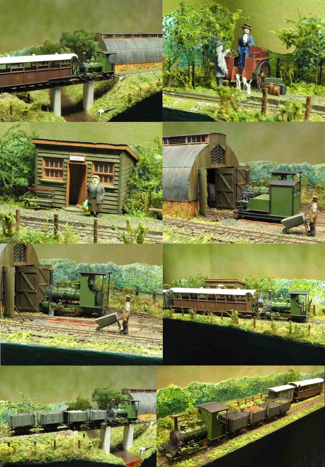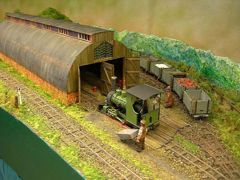 The above photos are from the Model Railway Journal articles published in 2006 and the words from the Narrow Gauge North website. I attended the Narrow Gauge North Show on 8/3/2008 at Benton Park School Harrogate Road, Leeds to see the layout and talk to Peter Kazer. His sources were the Hartley and Household books and Ron Evers web site. His model is greatly contracted in size, although the three main elements are to scale they were not that close together in reality. While it is a very detailed layout and appears accurate I do feel that there are a few errors that could have been avoided. Period photos don't appear to show an ash pit or wooden crossing outside the main doors and the third siding is missing. I believe the road crossing at the end of the platform should be wider as it had motorised traffic on it. He said the bridge was 2 1/2 in high which would make it only 10 not 12 ft actual height, perhaps the Stank was high at the time of modelling. Loco number plates are missing from the cab sides and the lack of driver figures looks wrong. Perhaps I'm just too pernickety J.