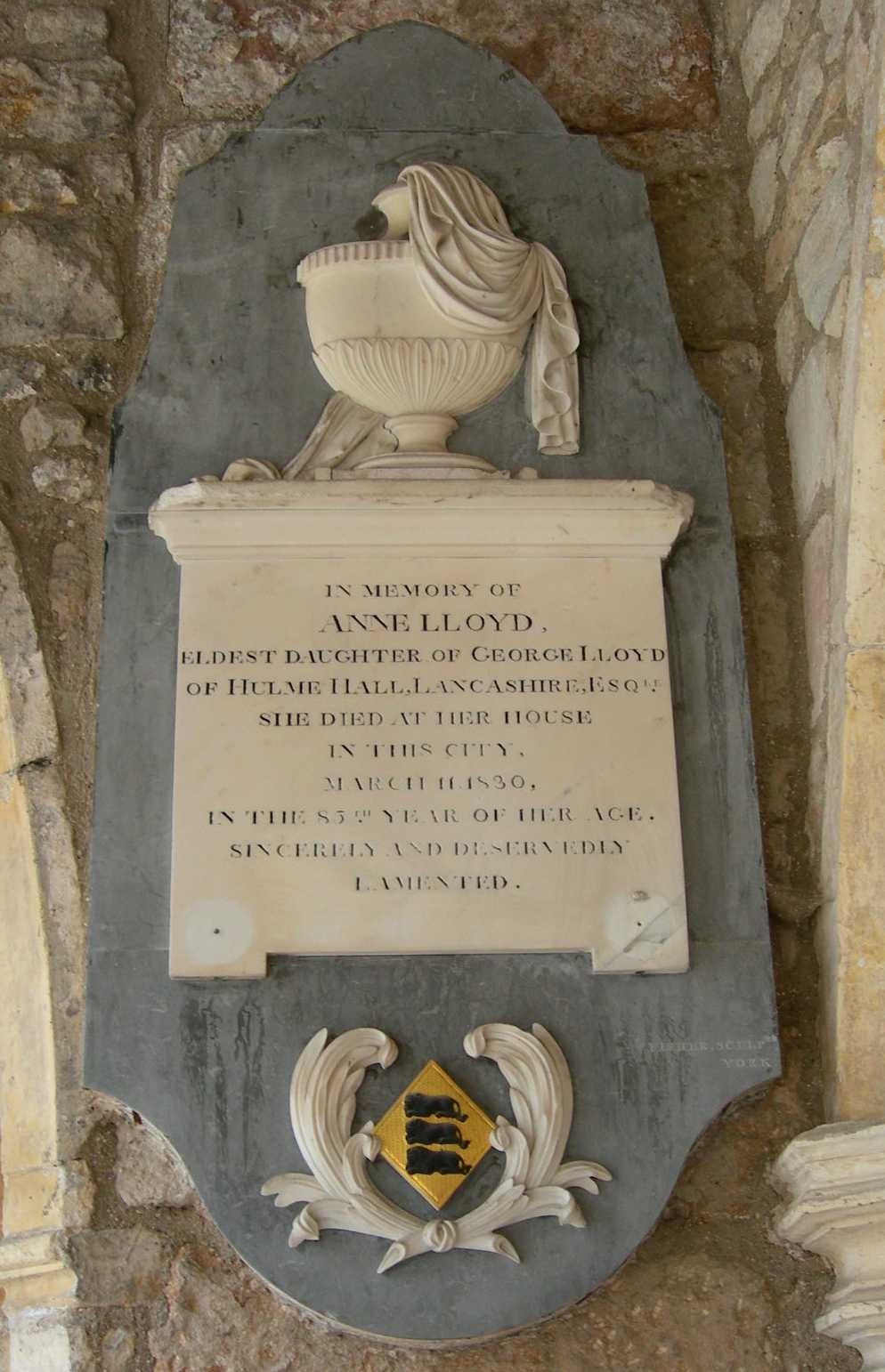 5) Susannah Lloyd was born on the 2 April 1747 at Hulme Hall and baptised on 27 May 1747 at Middleton by Oldham, Lancs. and died on 25 November 1830 at St Martin's, Micklegate, York.