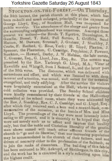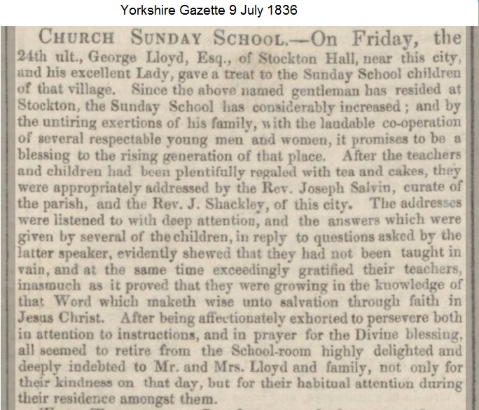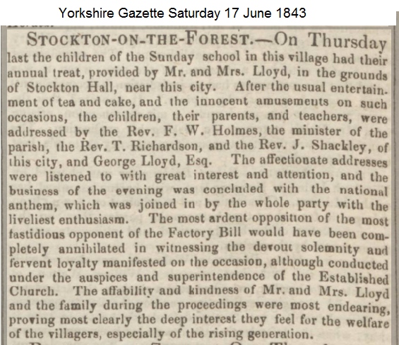 Children of Bedern Mission at Stockton Hall 18th Aug 1921, Photographed by Geo. H. Brooks, York. (postcard) The Lloyd Family The Agars of Brockfield were officially Lords of the Manor, but as they lived out of the village the Lloyd family took over the mantle of 'Lords of the Manor' and served the village well from 1850 to the death of the Mrs Mabel Ann Lloyd in 1947. George Lloyd - born 21 May 1787 died 12 March 1863 at his Home, Stockton Hall George purchased the Hall after the death of Harriet Plumer. Described as maintaining the character of a thorough English gentleman through out his long life. For many years was master of the York and Ainsty Hunt, and by his courteous and sportsman like conduct won for himself the greatest esteem and respect. As a magistrate he was zealous in the discharge of his duty, and was ever anxious to temper justice with mercy. He was chairman of Dame Wilson's Charity Trustees, and in various other offices of trust and responsibility he was ready to discharge public duties. He was an earnest member of the Established Church and a liberal patron of most of the institutions established to promote her usefulness. His private charities were marked alike by their munificence and by a studied avoidance of ostentation, his great aim to do the largest possible amount of good in the most quiet and unassuming manner. 1836 George Lloyd was a member of the Yorkshire Central Agricultural Associaton and was intending to attend their Agricultural Dinner announced in the York Herald of Sat 5 November 1836. George Lloyd of Stockton Hall was one of the12 men sworn of the Grand Jury at the Crown Court at the Castle under Mr Justice Williams on Monday 9 July 1838. (as was James Walker of Sand Hutton father/grandfather of Milo). and the Grand Jury, same place, under Mr Baron Rolfe on Monday 13 July 1840 (as was John Agar, Esq. of Hazel Bush). and the Grand Jury, same place under Mr Justice Coltman on Wednesday 12 July 1837. George Lloyd owned Fort Hall at Burlington Quay in 1837. He advertised in the Yorkshire Gazette of 28 January 1837 for it to be sold or let, furnished together with two small adjoining paddocks from Lady Day next. The Hall was occupied at the time by George Legard Esq. On 7 May 1839, by the Rev. Mr Bailey, at Castlebar, in the county of Wexford, Ireland, the Rev. Yarburgh Gamaliel Lloyd, Incumbent of Rawcliffe and Whitgift, in the West Riding of Yorkshire, and second son of George Lloyd, Esq. of Stockton Hall, to Editha, youngest daughter of the late Augustus William Le Hunte, Esq. of Artamont, in the county of Wexford. In June 1839 George subscribed £10 towards the planned improvements of the entrance into St Saviourgate, York. (Ex-villager George Hustwick was running the Greyhound Inn at the time which was one of the properties that was pulled down to make these improvements.) On Thursday the 23 July 1840, at Llan Rhos church near Conway, by the Rev. William Hughes, A.M., George John Lloyd, Esq. barrister-at-law, eldest son of George Lloyd, Esq. of Stockton Hall to Mary Antonia, third daughter of the late Samuel Chetham Hilton, Esq. of Pennington Hall, and Mostyn, in the county of Lancaster. York Herald Sat 26 Dec 1840 - York and Ainsty Foxhounds - It is rumoured that after the close of the present hunting season, George Lloyd Esq. of Stockton Hall, intends relinquishing the mastership of these hounds; a post which he has filled for many years, with great credit to himself, and the the satisfaction of the gentlemen of the hunt. Yorkshire Gazette Saturday 13 May 1843 - On Friday last George Lloyd Esq. of Stockton Hall, gave a hospitable entertainment at the White Swan Inn, in that village, to the workmen (25 in number) engaged in the re-building of the parish church. Yorkshire Gazette Saturday 24 February 1844 - At a general meeting of the York Dispensary, held at the Dispensary on Tuesday last, the benefactors and subscribers to this institution resolved unanimously that George Lloyd Esq. of Stockton Hall be appointed director of this institution, in the room of the late Rev. John Graham, deceased. G Lloyd had a number of cases of stuffed animals and birds including a small case of birds, stuffed by Mr Graham which contained a specimen of the mealy red-pole (linota canescens). Mr Graham had a shop in Jubbergate where the monthly meetings of the Yorkshire Naturalists' Club were held. Yorkshire Gazette 7 December 1850. Rabbit or Hare? In the Vol 1, 1851 edition of The Naturalist, while discussing a creature that had been shot in 1849 and was apparently a crossbreed having the body similar to that of a hare and a rabbit type head they said that there was no known interbreeding of the two animals. They did however mention an animal "which, had very much the appearance of what you would expect a hybrid between the Hare and the Rabbit to exihibit. Its head and feet, particularly, were like those of the Hare, while its general character was that of the Rabbit. We had only opportunity for examining it stuffed, and cannot, therefore, speak as to the nature of the flesh, or its osteological peculiarities. It was obtained on the estate of G. Lloyd, Esq., Stockton Hall, near York, in whose possession it is now." Miss Alicia Maria Lloyd On George's death in 1863 the Hall passed to his daughter Alicia, whose brother the Rev. George Lloyd Greame [taking that name from the inheritance of Yarburgh Graeme estate, became Yarburgh Yarburgh of Heslington]. The estate that devolved to George Jnr. was that of Sewerby House near Bridlington. Alicia Maria had built the new Island and Coast Society - Donations, Subscriptions and Collections - Mrs Lloyd and Miss Lloyd of Stockton Hall made a number of contributions between 1862 and 1871 to assist in the missionary work. In the Village Miss Lloyd was also most generous with endowments to the Church and the establishment of the School. She died in 1892 at the age of 77. It is said that whilst not officially Lady of the Manor she was