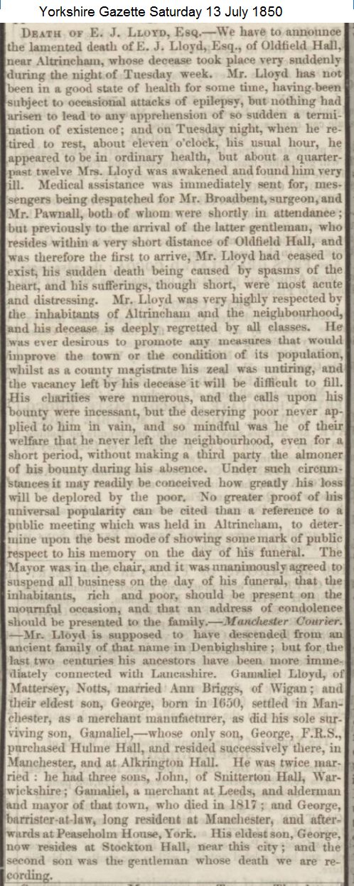 6) Elizabeth Lloyd was baptised on 8 May 1752 at Saint Ann, Manchester. She married Thomas Bateson Esq on 22 May 1779 at St Saviour, York. Their son Sir Robert Bateson MP of Belvoir Park was created a Baronet in 1816. 1) George Lloyd was baptised on 9 November 1748 at Middleton by Oldham, Lancs. and died on 12 October 1804. On 23 October 1781 at All Saints, Wakefield he married Elizabeth Naylor the daughter of Jeremiah Naylor a merchant of Wakefield. Elizabeth died on 30 October 1847. George was a Barrister at Law and lived in Manchester before moving to Acomb, York. George and Elizabeth had 5 children: 2) Edward Jeremiah Lloyd was born on 22 June 1790 and baptised on 11 August 1790 at Rostherne, Cheshire. He died in1850 at Altrincham and was buried on 10 July 1850 at Bowdon, Cheshire.