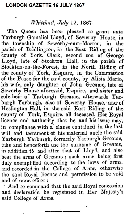 5) Rev Yarburgh Gamaliel Lloyd/Lloyd-Greame JP was born on 18 July 1813 and baptised on 31 July 1813 at Great Smeaton, yorks. He died on 30 May 1890.